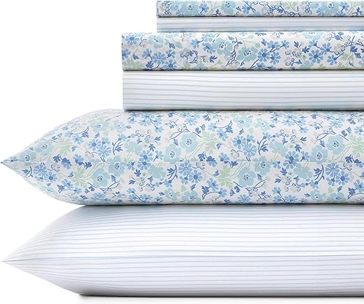 Amazon Com Laura Ashley Home Ticking Stripe Ultra Soft 6 Piece Percale Weave Sheet Set 100 Cotton Bedding Cool Crisp And Breathable King Jaynie Winter Green Home Kitchen