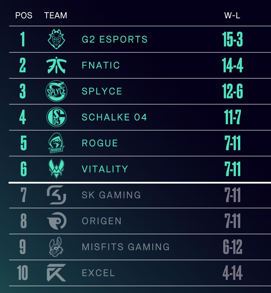 Teamgamesstr1g2 esports15 383 8w2fnatic13 572 1l3origen13 572 1l4mad lions11 761 1w5misfits gaming10.